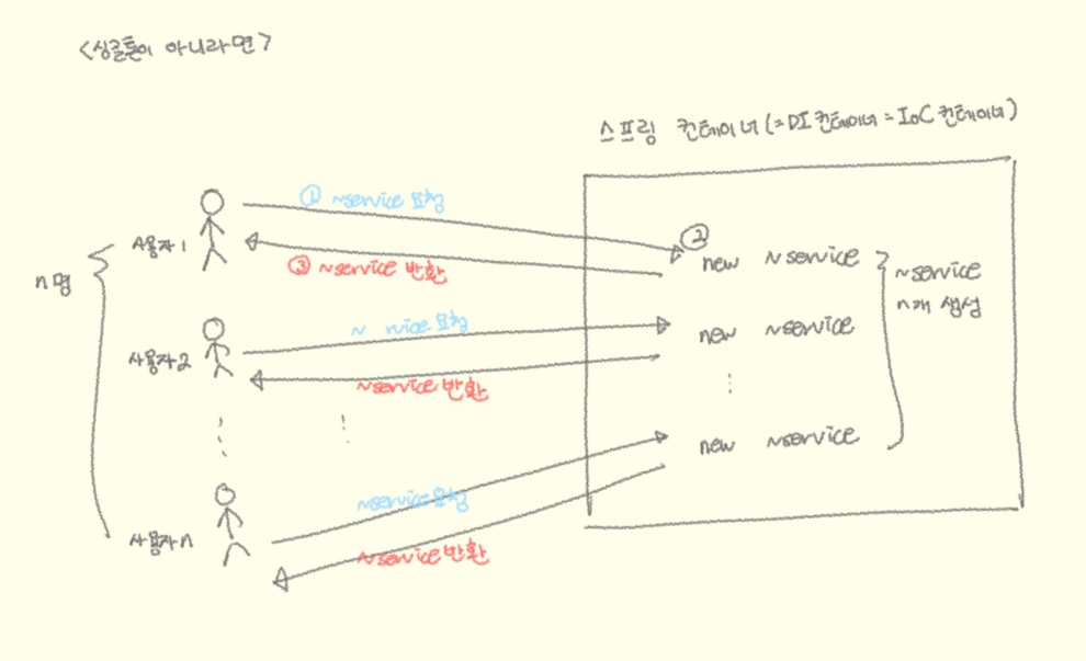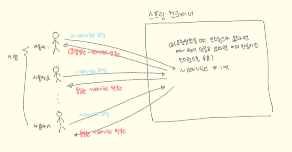 - 스프링 컨테이너는 객체를 하나만 생성해서 관리(빈으로 등록한 것들이 하나씩만 있음)