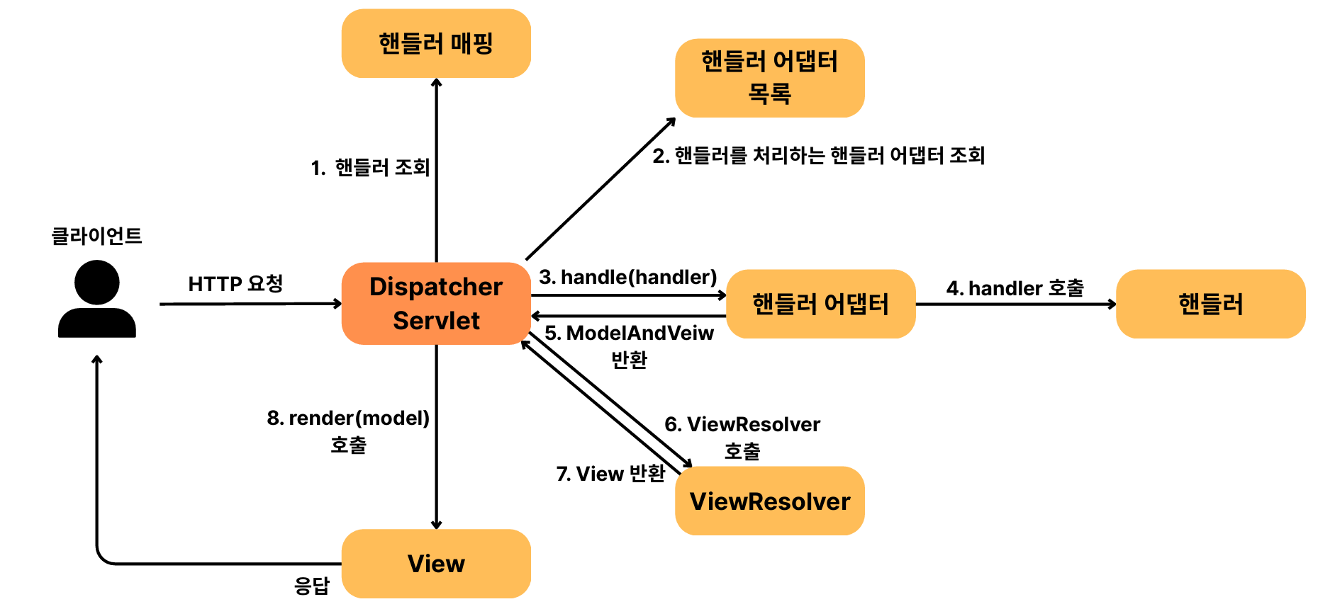 - 핸들러 어탭터를 조회해서 이 핸들러 어탭터로 핸들러를 호출해 ModelAndView를 반환한다.