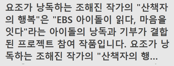 요조가 낭독하는 조해진 작가의 "산책자의 행복"은 "EBS 아이돌이 읽다, 마음을 잇다"라는 아이돌의 낭독과 기부가 결합된 프로젝트 참여 작품입니다. 요조가 낭독하는 조해진 작가의 "산책자의 행복"은 "EBS 아이돌이 읽다, 마음을 잇다"라는 아이돌의 낭독과 기부가 결합된 프로젝트 참여 작품입니다.